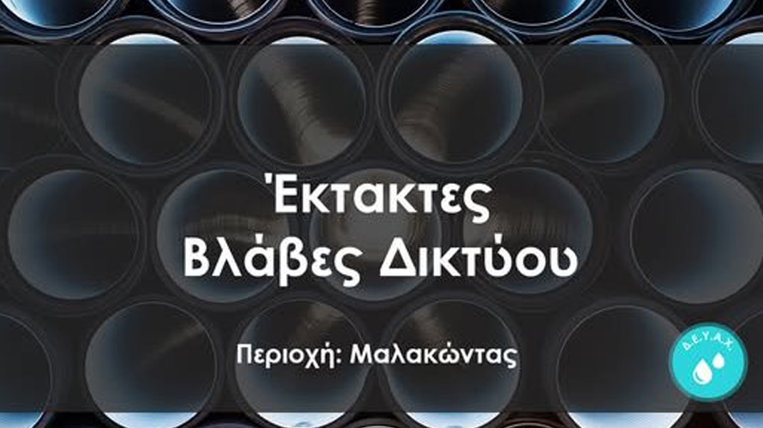 Διακοπή υδροδότησης παρουσιάστηκε στην περιοχή του Μαλακώντα, το βράδυ της Παρασκευής 20 Φεβρουαρίου, εξαιτίας έκτακτης βλάβης στο δίκτυο.