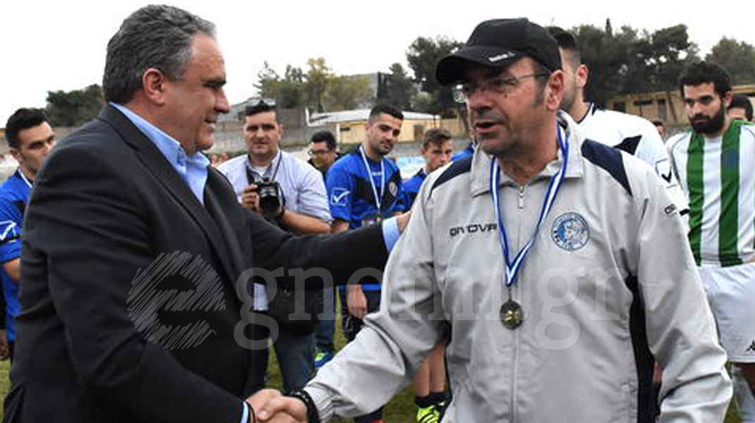 Ο αείμνηστος Γιώργος Ψαθάς παραδίδει το μετάλλιο του κυπελλούχου στον έμπειρο κόουτς Τάκη Σπυρόπουλο.