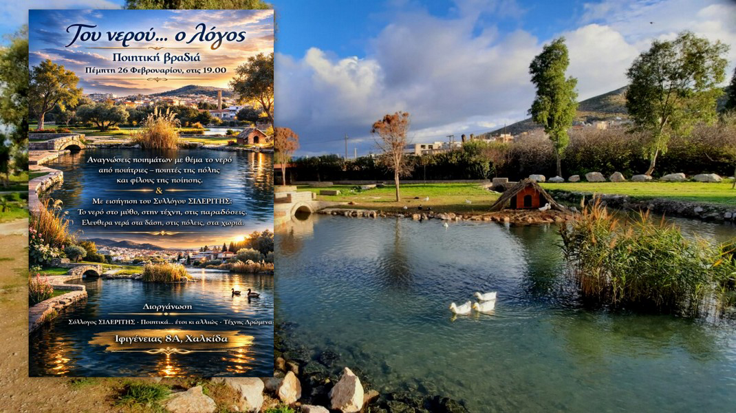 Μια ξεχωριστή ποιητική συνάντηση με κεντρικό άξονα το νερό διοργανώνουν η ποιητική ομάδα «Ποιητικά… έτσι κι αλλιώς» και ο Σύλλογος Σιδερίτης, την Πέμπτη 26 Φεβρουαρίου, στις 7 το απόγευμα, στον χώρο "Τέχνης Δρώμενα" (Ιφιγένειας 8Α, Χαλκίδα).