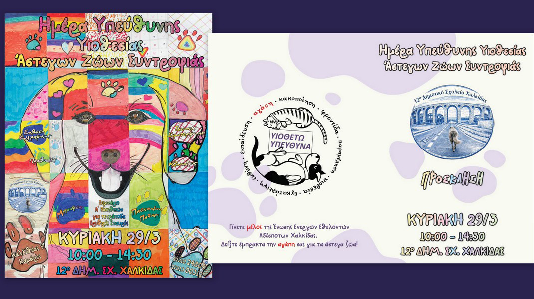Το 12ο Δημοτικό Σχολείο Χαλκίδας, σε συνεργασία με τον Δήμο Χαλκιδέων και την Περιφέρεια Στερεάς Ελλάδας, διοργανώνει την Κυριακή 29 Μαρτίου, από τις 10 το πρωί έως τις 2:30 το μεσημέρι, Ημέρα Υπεύθυνης Υιοθεσίας Αδέσποτων Ζώων Συντροφιάς, με αφορμή την Πανελλήνια Σχολική Ημέρα Φιλοζωίας και την Παγκόσμια Ημέρα για τα Αδέσποτα Ζώα.