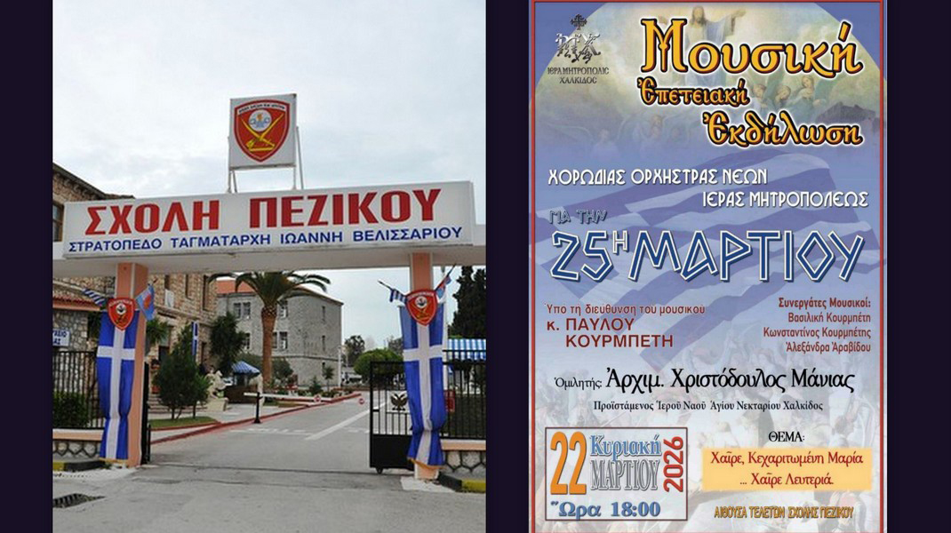 Την Κυριακή 22 Μαρτίου, στις 6 το απόγευμα, στην Αίθουσα Τελετών της Σχολής Πεζικού Χαλκίδας, θα πραγματοποιηθεί η καθιερωμένη εκδήλωση της Χορωδίας-Ορχήστρας Νέων της Μητρόπολης, αφιερωμένη στην Εθνική μας παλιγγενεσία του 1821.