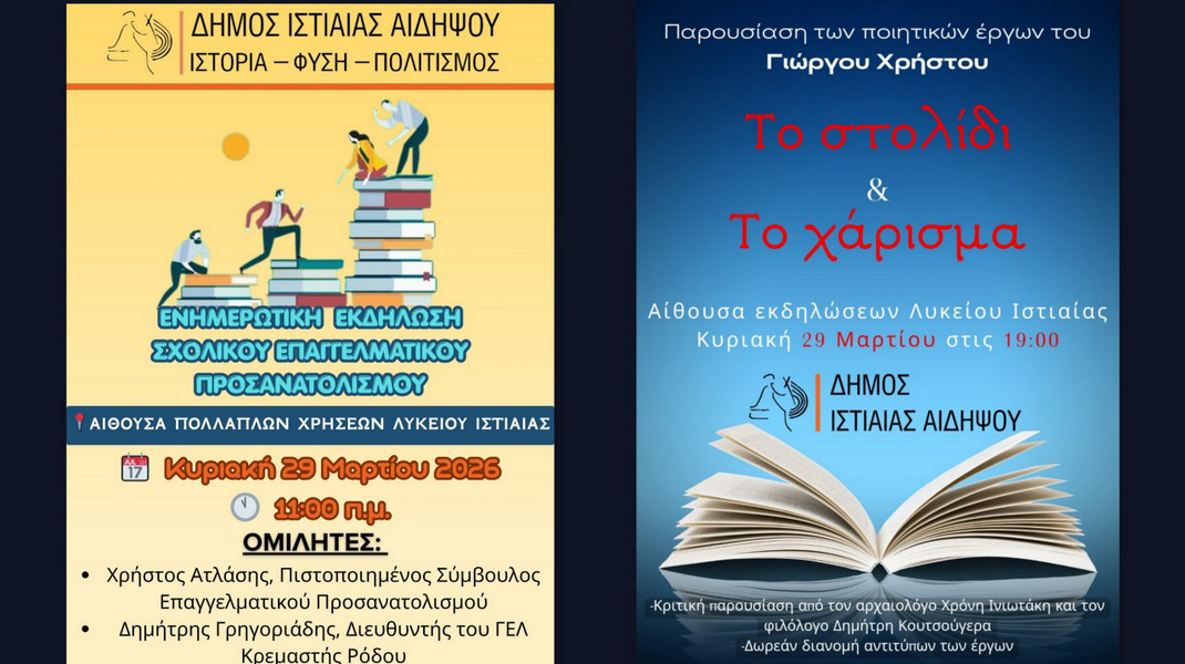 Την Κυριακή 29 Μαρτίου, η αίθουσα πολλαπλών χρήσεων του Λυκείου Ιστιαίας ανοίγει τις πόρτες της για δύο ξεχωριστές εκδηλώσεις με εκπαιδευτικό και πολιτιστικό χαρακτήρα.