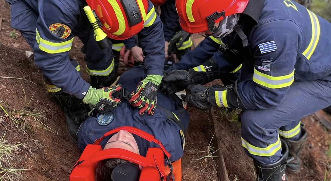 Πραγματοποιήθηκε εικονική μεταφορά τραυματία με όλες τις προφυλάξεις που απαιτούνται και το «θύμα» παραδόθηκε με ασφάλεια σε ασθενοφόρο.