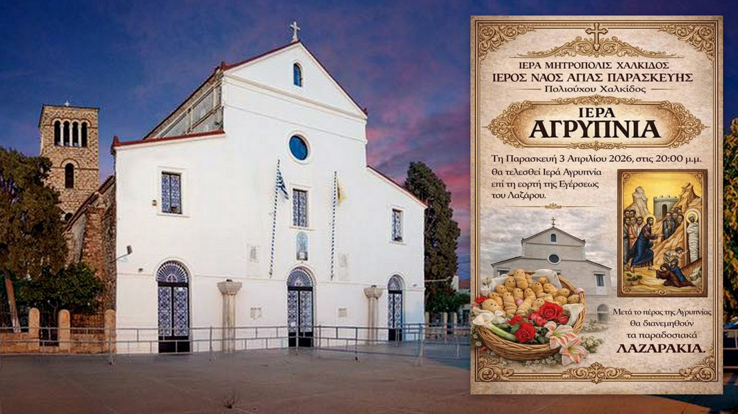 Ιερή Αγρυπνία θα τελεστεί την Παρασκευή 3 Απριλίου, στις 8 το βράδυ, στον ιερό ναό της Αγίας Παρασκευής, Πολιούχου Χαλκίδας, με αφορμή τη γιορτή της Εγέρσεως του Λαζάρου.