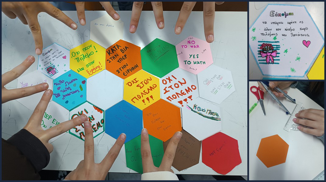 Στη συνέχεια, κάθε μαθητής δημιούργησε το δικό του έργο, καταγράφοντας ένα προσωπικό μήνυμα για τον πόλεμο και την ειρήνη, το οποίο διακόσμησε με χρώματα και συμβολικά σχέδια.