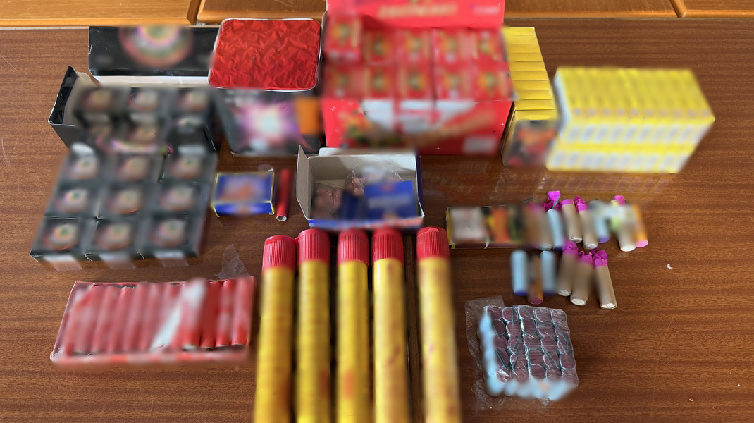 Εντοπίστηκαν στο κατάστημα και κατασχέθηκαν 1.977 κροτίδες διαφόρων τύπων, 2.601 παιδικά αθύρματα, ένα πυροτέχνημα με 25 βολές και πέντε ναυτικές φωτοβολίδες (καπνογόνα).
