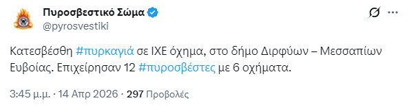 Φωτιά ξέσπασε το μεσημέρι της Τρίτης 14 Απριλίου σε ΙΧ αυτοκίνητο στη θέση "Άγιος", μετά τα Ψαχνά, στον δρόμο προς την Βόρεια Εύβοια, στον Δήμο Διρφύων - Μεσσαπίων.
