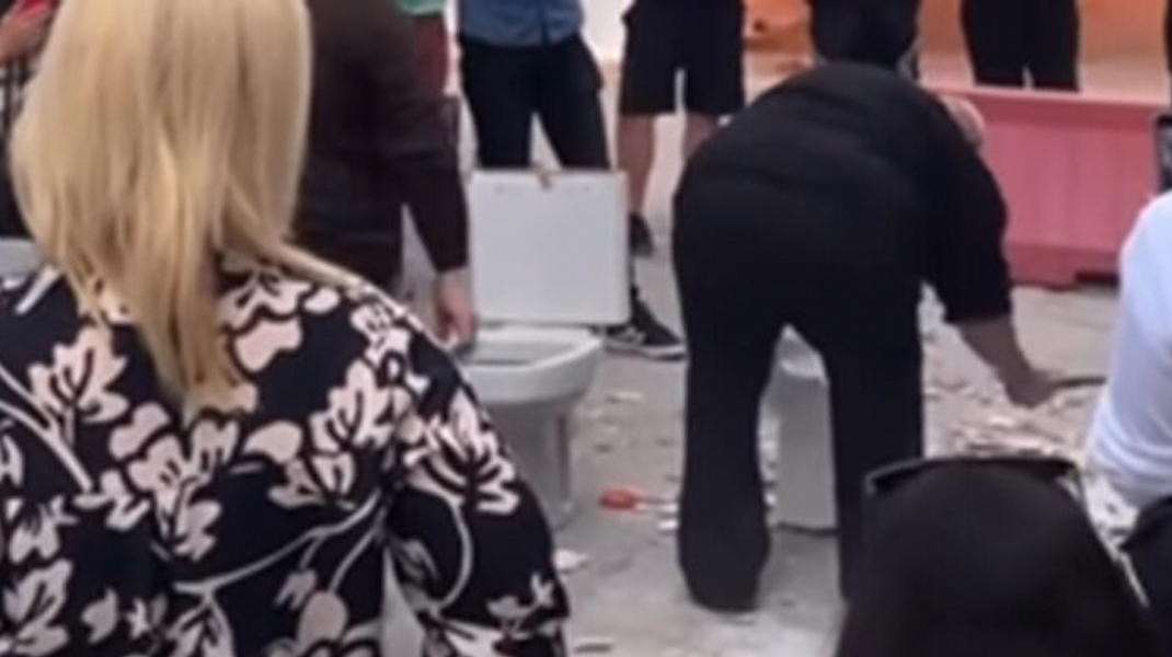 Οι "αρχισπάστες" με σφυρί και ηλεκτρικό τρυπάνι έκαναν κομμάτια μια τουαλέτα και το γλέντι συνεχίστηκε σε κεντρικό δρόμο της πόλης με χορό, λαϊκά τραγούδια και σούβλες...