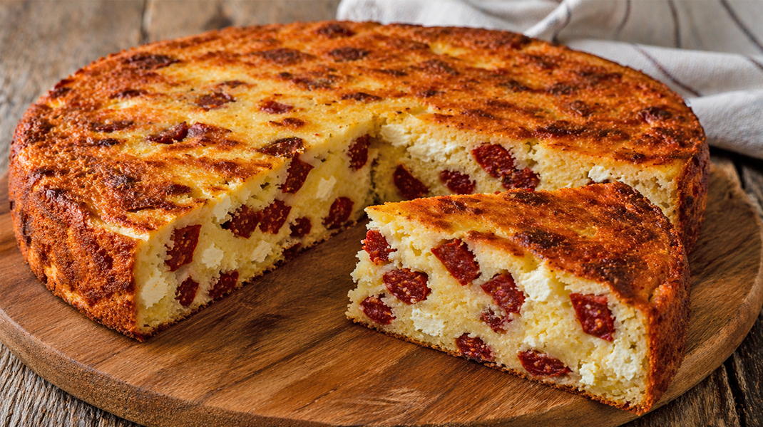 Σε ένα ταψί που το έχουμε λαδώσει και το έχουμε πασπαλίσει με λίγο σιμιγδάλι, αδειάζουμε το χυλό και ψήνουμε σε προθερμασμένο φούρνο στους 180 βαθμούς για περίπου 35 λεπτά, μέχρι να ροδίσει καλά η πίτα.