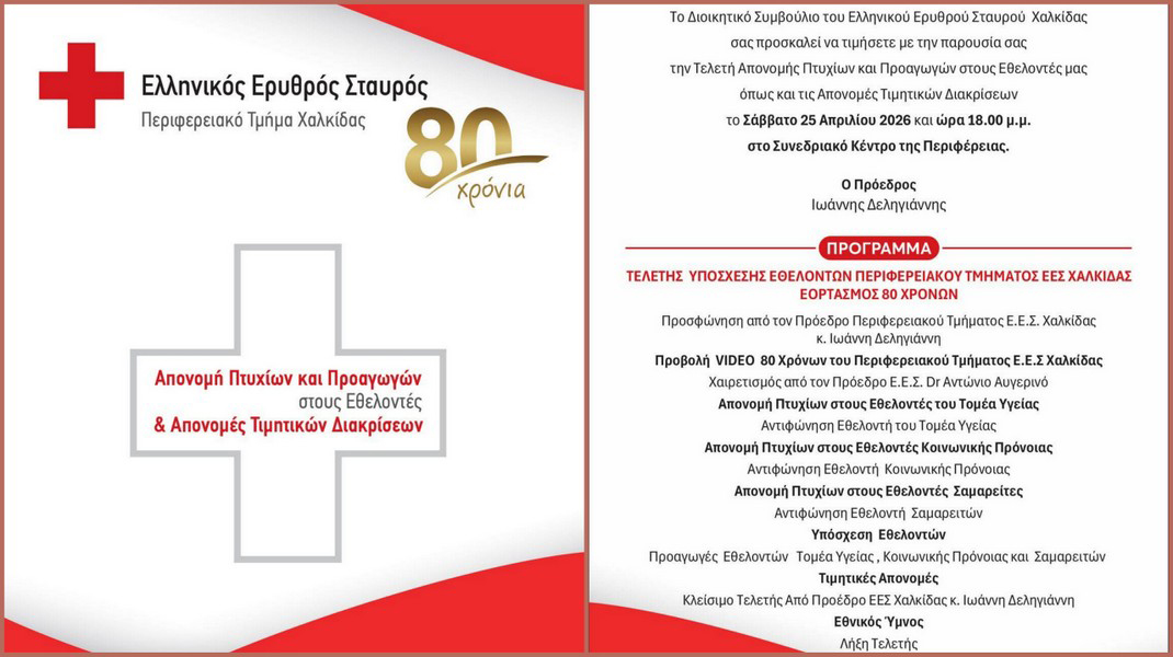 Εκδήλωση αφιερωμένη στην αναγνώριση της προσφοράς των εθελοντών του διοργανώνει το Διοικητικό Συμβούλιο του τοπικού τμήματος Χαλκίδας του Ερυθρού Σταυρού.
