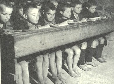 Δείτε στη φωτογραφία πάνω πόσα παιδιά κάθονταν στο ίδιο θρανίο, ενώ η λεπτομέρεια που δείχνει την φτώχεια στην ελληνική κοινωνία είναι ότι οι μαθητές είναι ξυπόλητοι, καθώς οι γονείς τους δεν είχαν λεφτά για να τους αγοράσουν παπούτσια.