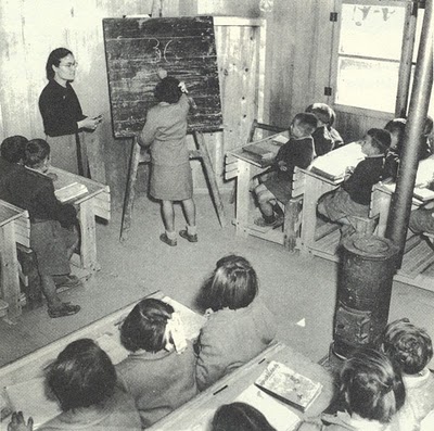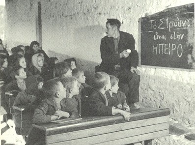 Στη φωτογραφία αριστερά βλέπετε μία τυπική ελληνική τάξη δημοτικού σχολείου την δεκαετία του 1950, με την δασκάλα όρθια, χωρίς έδρα.