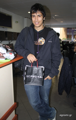 Με τσαντάκι από γνωστό κατάστημα καλλυντικών βρήκαμε σε κατάστημα, στην οδό Κριεζή, τον Σπύρο Λαλιάρη και μας κέντρισε την περιέργεια. Αυτός μας αποκάλυψε ότι: "Είναι το δώρο που αγόρασα για την κοπέλα μου."