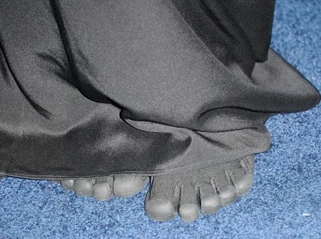 Η μικρή όμως σταρλετ δεν άντεξε τον πόνο και την κούραση των δωδεκάποντων τακουνιών της κι έτσι στο πάρτυ που ακολούθησε την απονομή συνόδευσε την εντυπωσιακή Μarchesa τουαλέτα της (δεξιά) με εφαρμοστά λαστιχένια παπουτσάκια τύπου Ninja (κάτω).