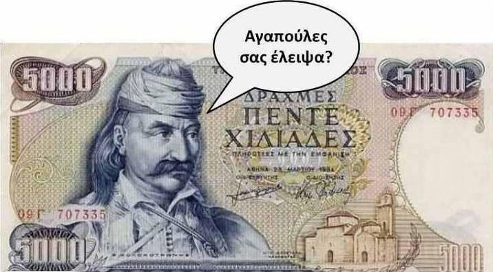 Είναι το παλιό χαρτονόμισμα των 5.000 δραχμών, με τον Κολοκοτρώνη, που ρωτάει ...πονηρά: Αγαπούλες σας έλειψα;