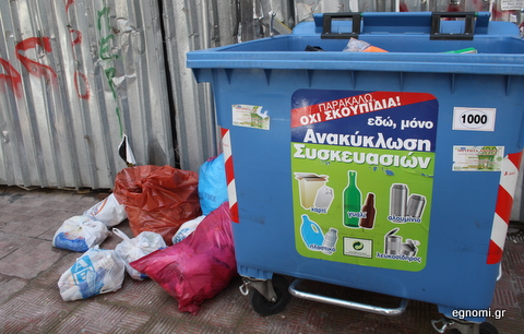 Στην οδό Αβάντων, οικιακά σκουπίδια έξω από τον μισογεμάτο κάδο ανακύκλωσης.