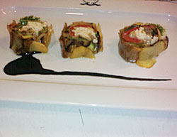 Λαδώνω καλά ένα μεγάλο φύλλο αλουμινόχαρτο. Τοποθετώ επάνω του ένα φύλλο πλαστικής μεμβράνης. Απλώνω τις φέτες των λαχανικών έτσι ώστε να υπερκαλύπτουν η μια φέτα την άλλη και δημιουργώ 1 παραλληλόγραμμο 20Χ28. Απλώνω τη σκορδαλιά, επάνω στην τελευταία στρώση λαχανικών και ρολάροντας από την κοντή πλευρά, τυλίγω σφιχτά σε ρολό. Τοποθετώ στο ψυγείο για 1 ώρα. Κόβω σε φέτες και σερβίρω ραντισμένο με ξίδι μπαλσάμικο.