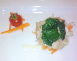 Φέρνω το ζωμό σε βρασμό και ρίχνω μέσα το κρέας. Χαμηλώνω τη φωτιά και αφήνω το κρέας μόλις να σιγοβράζει για 20 λεπτά. Στα τελευταία 5 λεπτά θα προσθέσω και τα καρότα. Στο μεταξύ, σε μπόλικο αλατισμένο νερό που βράζει, ρίχνω τα χόρτα και βράζω για 6-8 λεπτά. Μεταφέρω τα χόρτα σε τρυπητό και τα στραγγίζω καλά. Αφαιρώ το κοτόπουλο και τα καρότα και προσθέτω στο ζωμό που έβρασε την κρέμα και τα χόρτα κομμένα. Καρυκεύω και μόλις πάρει βράση προσθέτω ξανά το κοτόπουλο, τα καρότα και το χυμό του λεμονιού και αφήνω για 1 μόλις λεπτό.