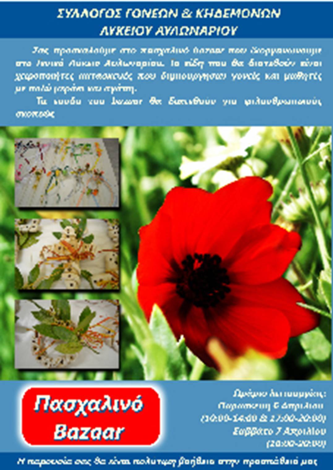 Ο Σύλλογος Γονέων και Κηδεμόνων του Γενικού Λυκείου Αυλωναρίου διοργανώνει Πασχαλινό Bazaar στο Γενικό Λύκειο Αυλωναρίου την Παρασκευή 6 και το Σάββατο 7 Απριλίου.