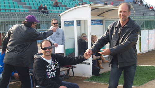 Υπενθυμίζουμε ότι ο Γιώργος τραυματίστηκε πριν ένα χρόνο στη διάρκεια προπόνησης με μηχανή motocross και από τότε κινείται με αναπηρικό καροτσάκι. Ωστόσο, έχει μεγάλη θέληση και το παλεύει σκληρά ώστε να μπορέσει να συγκεντρώσει τις 100.000 ευρώ που απαιτούνται για την εγχείρισή του και να μπορέσει να ξαναπερπατήσει. (Στη φωτό πάνω ο πρόεδρος του Δ.Σ. Γιάννης Παπακωνσταντίνου και ο αναπληρωτης ταμίας Γιώργος Αλαφάκης με τον Γιώργο).