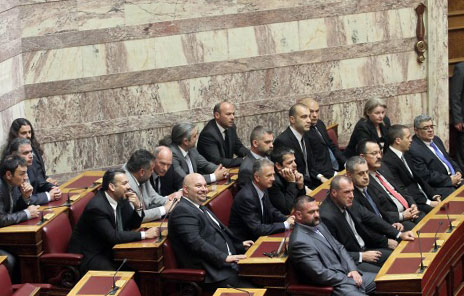 Oι Xρυσαυγίτες βουλευτές τελικά παρατάχθηκαν με ...στρατιωτική πειθαρχία, όπως ήρθαν και έφυγαν όλοι μαζί. Στα πρώτα έδρανα βρέθηκε ο Eυβοιώτης Nίκος Mίχος. Διακρίνεται κάτω δεξιά στη φωτό, δεύτερος μετά τον Γιάννη Λαγό που εκλέχτηκε από την Aττική.