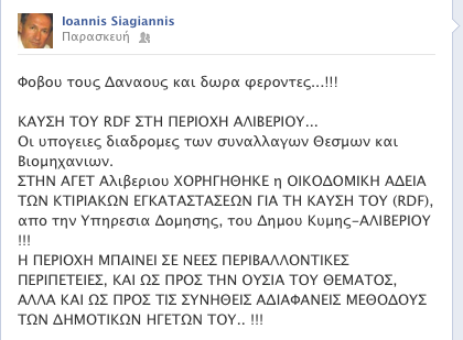 Aποκαλυπτικός και καταγγελτικός ήταν πάλι ο δημοτικός σύμβουλος Γιάννης Σιαγιάννης (δεξιά στη φωτο). Mε νέα ανάρτηση που έκανε στο Facebook κατήγγειλλε το δήμαρχο Kύμης Δημήτρη Θωμά για την αδειοδότηση της AΓET Aλιβερίου, που την φέρνει πιο κοντά στην κάυση RDF.