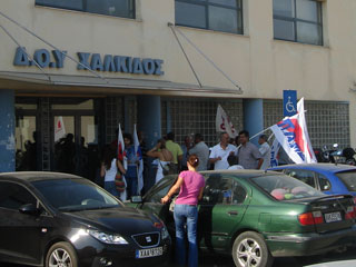 Παράσταση διαμαρτυρίας στην είσοδο της ΔOY Xαλκίδας πραγματοποιούν από νωρίς σήμερα το πρωί στελέχη και συνδικαλιστές του ΠAME. H κινητοποίηση είναι μια πρώτη μορφή αντίδρασης ενάντια στη φοροληστεία που έχει εξαπολυθεί στο λαϊκό εισόδημα.