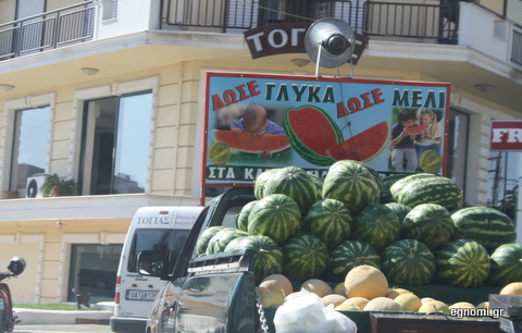 Την αξία της διαφήμισης έχει κατανοήσει πλήρως ο τσιγγάνος, που πουλάει καρπούζια και πεπόνια. Όπως βλέπετε στη φωτογραφία, δεν αφήνει στην ... τύχη την πώλησή τους, αλλά με μία καλαίσθητη πινακίδα τονίζει ότι είναι " δώσε γλύκα, δώσε μέλι".