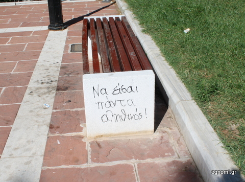 Σε παγκάκι της πλατείας Τζαμιού, απέναντι ακριβώς από το 1ο Δημοτικό Σχολείο Χαλκίδας, είναι γραμμένο το σύνθημα-προτροπή, που βλέπετε στη φωτογραφία και αποτελεί μία πάντα επίκαιρη ρήση, χρήσιμη για όλους.