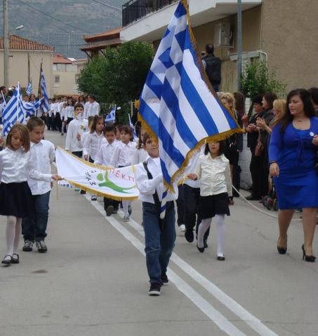 Τα παιδιά παρέλασαν κρατώντας την ελληνική σημαία, καθώς και δύο περιστέρια, τα οποία έγραφαν "ΕΙΡΗΝΗ ΟΧΙ ΠΟΛΕΜΟ".
