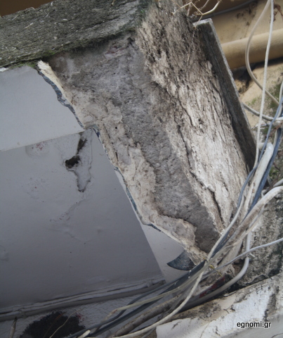 Η γωνία του έχει ...φαγωθεί και ... βρέχει κομμάτια από μπετόν και σοβάδες.