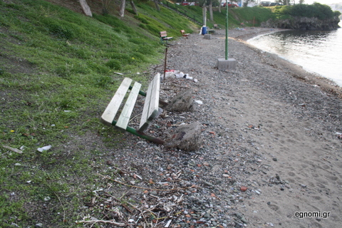 Στη φωτό δεξιά βλέπετε το διαλυμένο παγκάκι και παρακολουθήστε στις φωτογραφίες κάτω τις υπόλοιπες καταστροφές. Λες και πέρασε ...τυφώνας από την συγκεκριμένη παραλία της Χαλκίδας.