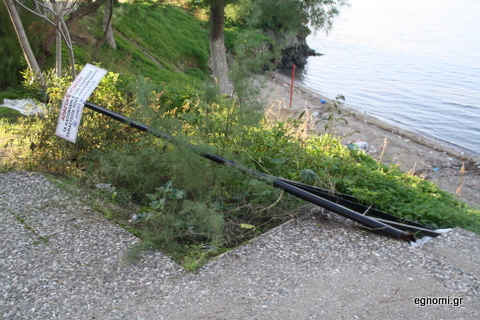 Το κάγκελο κατεστραμμένο και η ταμπέλα κάτω στα σκαλοπάτια που οδηγούν στην πλαζ.