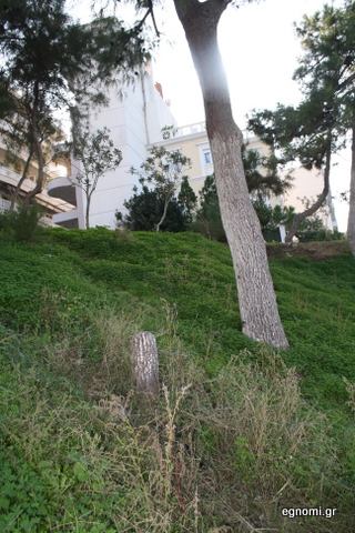Ανάμεσα στα άλλα στραβά, που είδαμε, διαπιστώσαμε ότι λείπει και ένα πευκάκι, το οποίο έχει κοπεί σχεδόν από τη ρίζα. Αυτό μάλλον θα καταλήξει σε κάποιο τζάκι για καυσόξυλα.