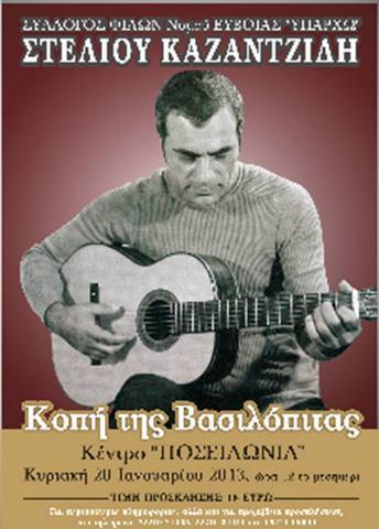 Ο σύλλογος Φίλων του Στέλιου Καζαντζίδη νομού Εύβοιας "Υπάρχω" πραγματοποιεί εκδήλωση για την κοπή της πρωτοχρονιάτικης πίτας την Κυριακή 20 Ιανουαρίου, στη μία το μεσημέρι, στο κέντρο "Ποσειδωνία", στον Καράμπαμπα, στο δρόμο προς Άγιο Μηνά.