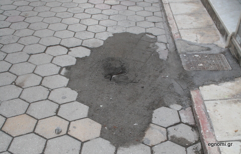Αποτέλεσμα και το οπτικό αποτέλεσμα να μην είναι το καλύτερο, αλλά να υπάρχει και λειτουργικό θέμα, αφού αν προσέξετε καλά στη φωτογραφία κάτω οι κυβόλιθοι δεν έχουν κολλήσει καλά και στα κενά που έχουν δημιουργηθεί μπορεί ανά πάσα στιγμή να σκαλώσει κανένα τακούνι, με απρόβλεπτες συνέπειες.
