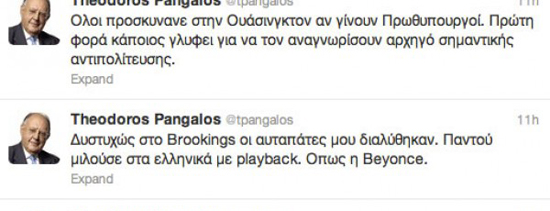 «Δυστυχώς στο Brookings οι αυταπάτες μου διαλύθηκαν. Παντού μιλούσε στα ελληνικά με playback. Όπως η Beyonce»,έγραψε ο Πάγκαλος, αλλά πιο θανατηφόρο ήταν το επόμενο σχόλιο του: «Όλοι προσκυνάνε στην Ουάσιγκτον αν γίνουν πρωθυπουργοί. Πρώτη φορά κάποιος γλύφει για να τον αναγνωρίσουν αρχηγό σημαντικής αντιπολίτευσης».