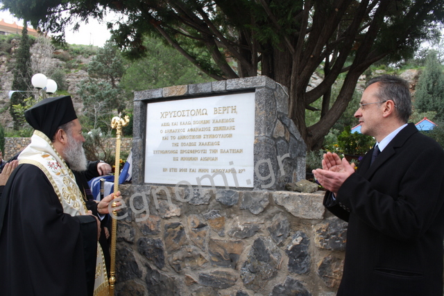Με κάθε επισημότητα έγινε σήμερα το πρωί η ονοματοθεσία του χώρου απέναντι από το ναό του Αγίου Σπυρίδωνα στον Μπαταργιά. Πήρε το όνομα του μακαριστού Μητροπολίτη Χαλκίδας Χρυσοστόμου Α' (Βέργη) που είχε ιδρύσει και οναμάσει τον παρακείμενο ναό.