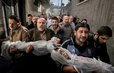 Ο φωτογράφος κατάφερε να συλλάβει τις σπαρακτικές εκφράσεις των ανδρών που κουβαλούν στα χέρια τους τις σορούς των παιδιών τους, που έχασαν τη ζωή τους από ισραηλινή επιδρομή, σε ένα στενό δρομάκι της Γάζας.
