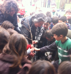 Στη φωτογραφία η συγγραφέας, μαζί με τους μαθητές, φυτεύει την φουντουκιά.