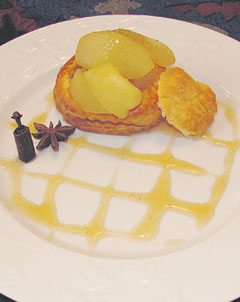 Σε τηγάνι ρίχνω τη σκούρα ζάχαρη με το βούτυρο και το κονιάκ και φέρνω σε βρασμό μέχρι να αρχίσει το σιρόπι να καραμελώνει. Προσθέτω τα μήλα και τα αρωματικά και αφήνω για 5 λεπτά στη φωτιά ανακατεύοντας. Για να στήσω, κόβω στη μέση οριζόντια τους δίσκους της σφολιάτας. Τοποθετώ σε πιάτο το κάτω μέρος του δίσκου, βάζω μια κουταλιά κρέμα μέσα και γεμίζω το δίσκο με μήλα. Ρίχνω επάνω λίγο σιρόπι και τοποθετώ το άλλο μισό του δίσκου.