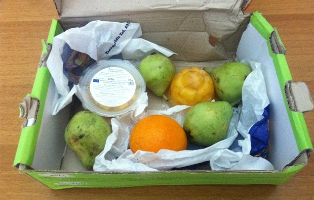 Από ένα χαρτονένιο κουτί γεμάτο φρούτα και φρουτοσαλάτες παρέλαβαν οι μαθητές στα δημοτικά σχολεία της Χαλκίδας την Παρασκευή 15 Μαρτίου, στα πλαίσια ευρωπαϊκού προγράμματος, που υλοποιεί το Υπουργείο Αγροτικής Ανάπτυξης και τροφίμων.