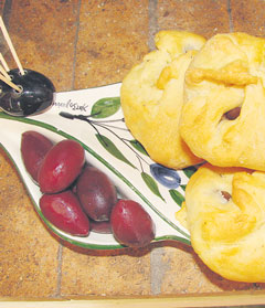 Σε μία κούπα νερό διαλύω τη μαγιά και το μέλι. Τοποθετώ τα υπόλοιπα υλικά εκτός από τις ελιές, στο μίξερ και προσθέτω και το διάλυμα της μαγιάς. Ζυμώνω για 8 περίπου λεπτά μέχρι να σχηματιστεί μια μαλακιά, ελαστική ζύμη. Τη λαδώνω καλά, τη σκεπάζω και την αφήνω να διπλασιαστεί σε όγκο (2 ώρες περίπου). Την πατώ να «πέσει», τη χωρίζω σε 24 μπαλάκια και πλάθω το κάθε ψωμάκι βάζοντάς του μέσα και λίγες ελιές. Τοποθετώ σε ταψί στρωμένο με αντικολλητικό χαρτί, ελαφρά λαδωμένο και αφήνω να ανέβουν πάλι (περίπου 1 ώρα). Ραντίζω τα ψωμάκια με νερό και ψήνω σε μέτριο φούρνο στους 190 βαθμούς για 30 περίπου λεπτά.