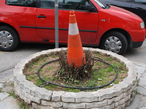 Για την ...ιστορία, να αναφέρουμε ότι το συγκεκριμένο κυκλικό παρτέρι βρίσκεται στον πεζόδρομο των Δικαστηρίων. Όσο για τον κώνο είναι άγνωστο πώς φύτρωσε ( κατά κυριολεξία πλέον) στο συγκεκριμένο σημείο.