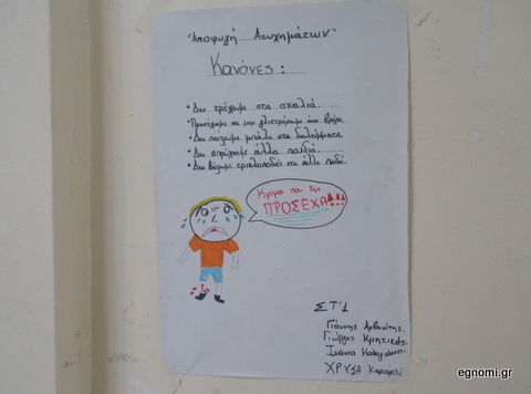 Οι μαθητές της ΣΤ΄τάξης του 15ου Δημοτικού Σχολείου Χαλκίδας ( βρίσκεται στη Λεωφόρο Θηβών) κατασκεύασαν την αυτοσχέδια αφίσα για να εφιστήσουν την προσοχή στους συμμαθητές τους, ώστε να αποφύγουν τα ατυχήματα.