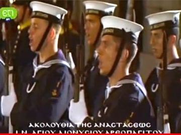Ενα άγημα από τη Σχολή Ναυτικών Δοκίμων άρχισε να ψέλνει τον εθνικό ύμνο την ώρα που ακουγόταν το "Χριστός Ανέστη" από τους κληρικούς. Μάλιστα, παρών στην Αναστάσιμη Ακολουθία ήταν και ο Αρχιεπίσκοπος Ελλάδος Ιερώνυμος, ο οποίος έψελνε μαζί με τους υπόλοιπους παπάδες.