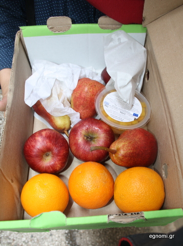Τους τα μοίρασαν στο σχολείο, στα πλαίσια του γνωστού προγράμματος της Ευρωπαϊκής Ένωσης, για να μάθουν να τρώνε φρούτα οι μαθητές. Σχετικά με το περιεχόμενο του κουτιού, όπως βλέπετε στη φωτό κάτω, περιείχε μήλα, πορτοκάλια, αχλάδια και ένα κεσεδάκι με φρουτοσαλάτα.