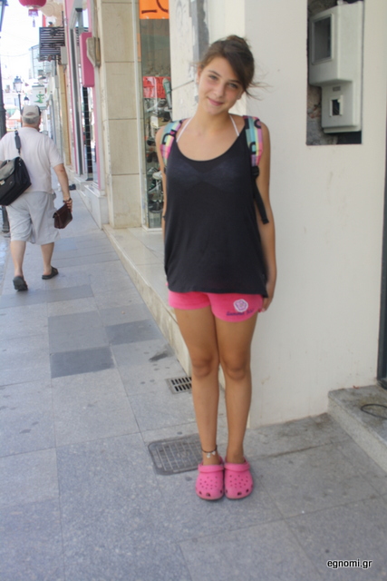 Η μαθήτρια πρώτης γυμνασίου (αν και από το ύψος της φαίνεται μεγαλύτερη), δηλώνει στο egnomi.gr πως ακολουθεί τη δική της μόδα. Την πετύχαμε την ώρα που πήγαινε για μπάνιο στην πλαζ Παπαθανασίου, και, όπως φαίνεται διακριτικά στην φωτογραφία, το πάνω μέρος του μαγιό της είναι άσπρο, απλό και ωραίο.