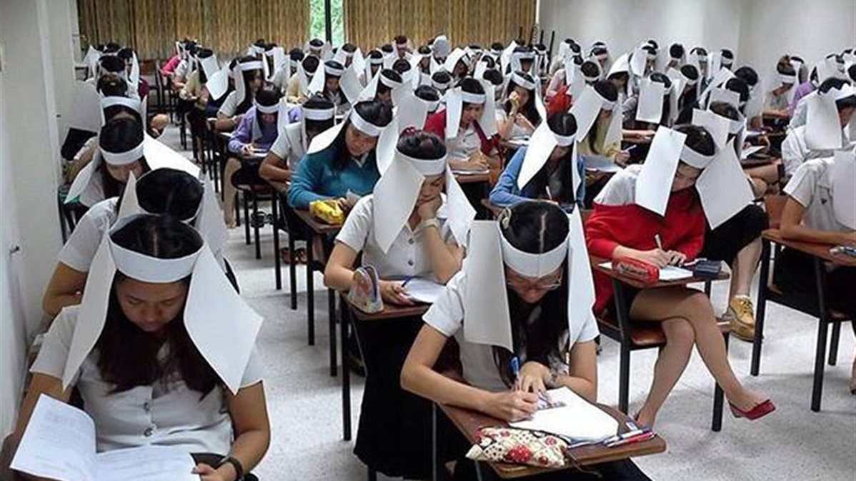 Δυο χαρτόνια δεξιά και αριστερά στο κεφάλι τους -σαν άλογα με παρωπίδες- έχουν οι φοιτητές Πανεπιστημίου της Μπανγκόγκ και ο λόγος είναι για να μην αντιγράφουν!