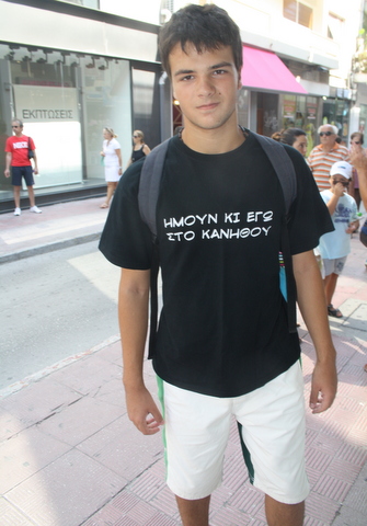 Γράφει "Ήμουν κι εγώ στο Κανήθου" και αποτελεί αναμνηστική μπλούζα από τα γυμνασιακά χρόνια του Γιάννη. Όλοι οι συμμαθητές του αποφάσισαν να τυπώσουν αυτή την φράση σε μπλουζάκια, για να θυμούνται τα υπέροχα χρόνια, που πέρασαν στο σχολείο τους.